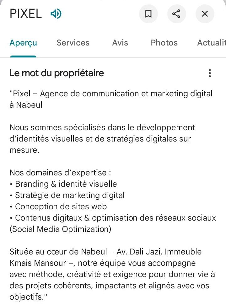 Soyez clair, concis et pertinent. Parlez de vos services, de vos atouts et de votre localisation, tout en intégrant des mots-clés utiles pour le SEO local.